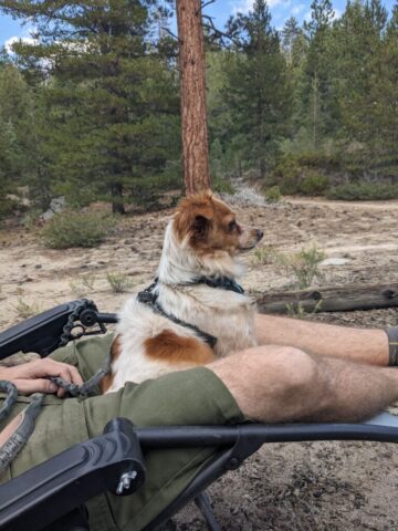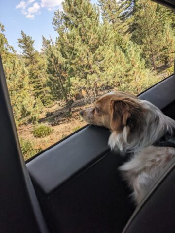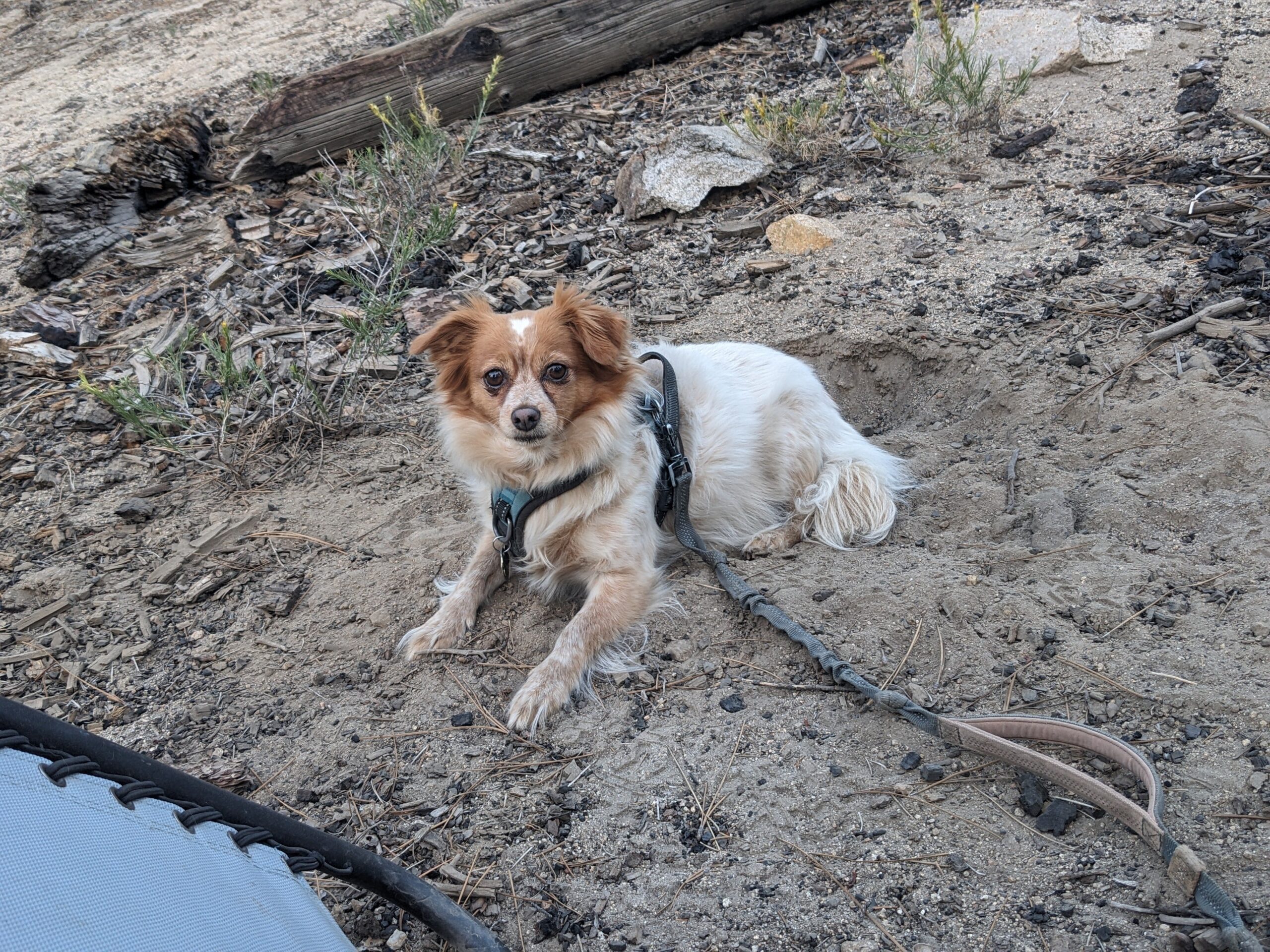 Finding a dispersed camping site with a ring didn’t prove difficult even with the swaths of people crowding the area near the highway. Lucy was excited for smells the whole ride and in sentry mode once we got to camp, keeping an eye out for danger (only motorbikes were around) and digging herself a hole for comfort.