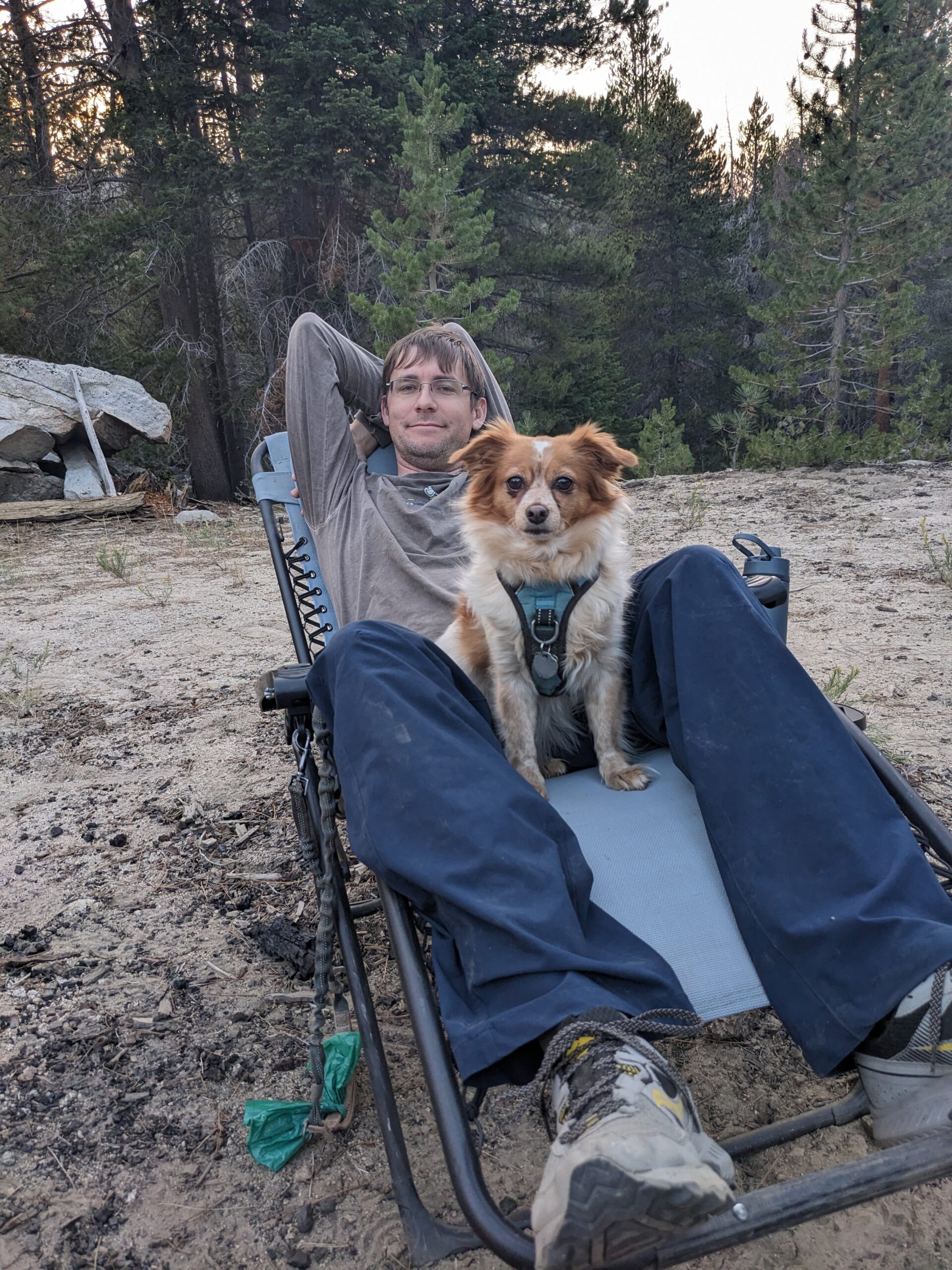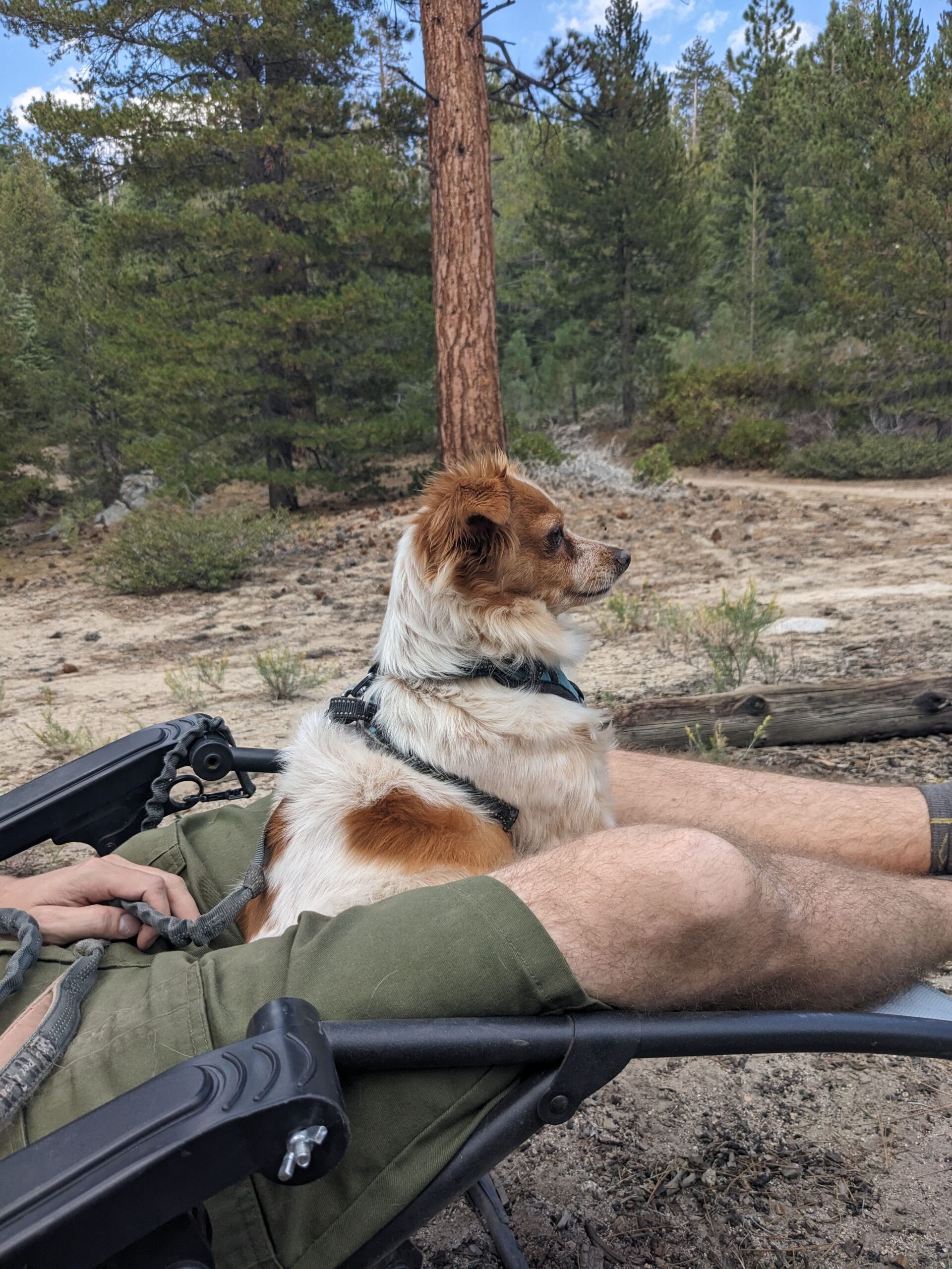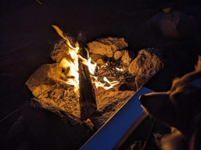 Since we didn’t arrive until about 4pm we relaxed for a bit, then took a short walk which I followed up with a quick run to explore the area. As the sun went down, we started the fire (thankfully still permitted above 5,000ft) and did the mandatory campfire hot dogs which Lucy was intensely interested in of course!