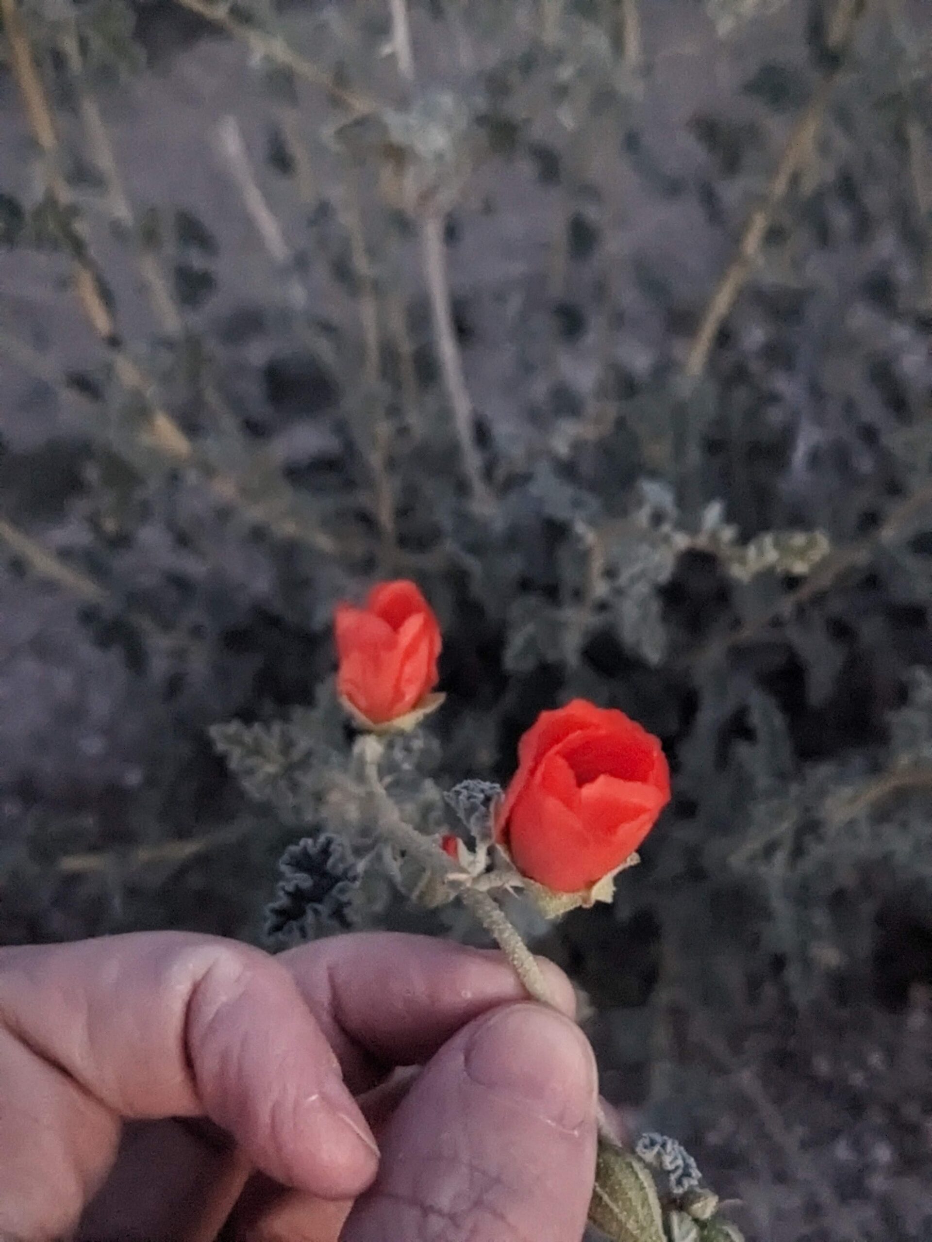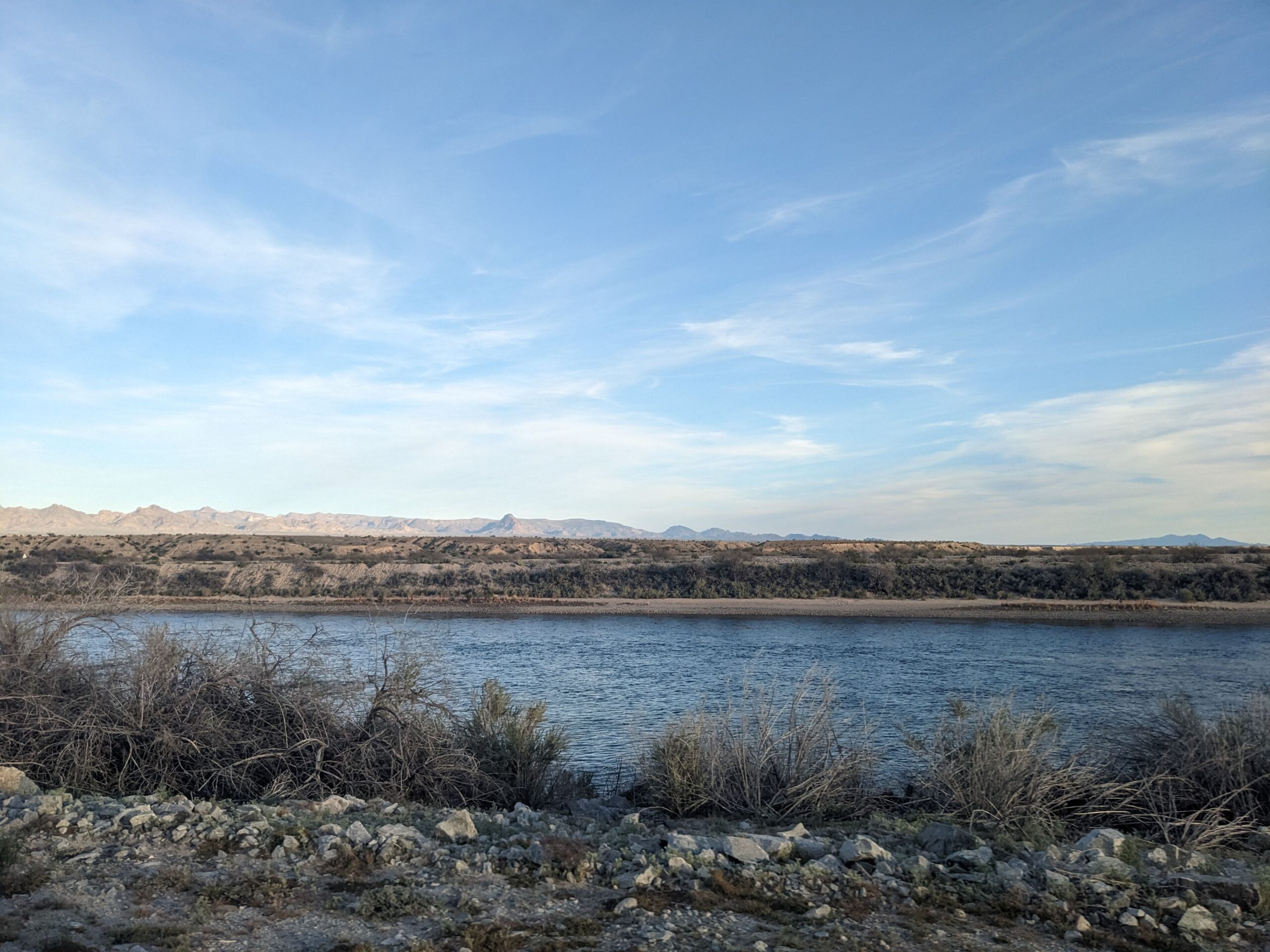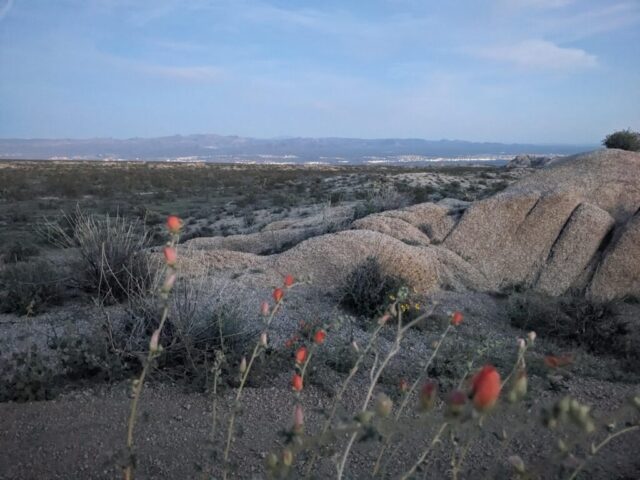 The road started off near the town of Fort Mojave north of Needles, CA, along the Colorado River. We arrived to town relatively late, and so only drove about 11 miles of the route before stopping at a beautiful viewpoint for the night. In addition to the lights of the city and sunset over the Mojave (including watching a rocket launch from Santa Barbara), there were lots of little rose-like flowers. Since there was no firepit, we skipped the fire and used signal from the truck to watch a movie, definitely a perk of Tesla!